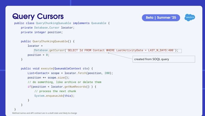 Query Cursors introduce a cursor-based SOQL execution model — meaning you can query massive datasets and process them incrementally without hitting query or heap size limits.