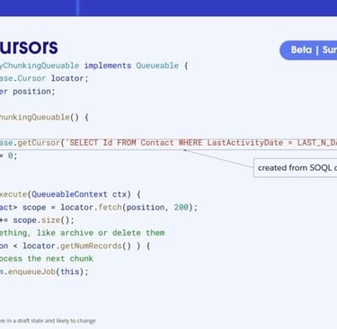 Discover how Salesforce’s new Query Cursors (Beta) transform large data processing in Apex. Learn how they eliminate the need for Batch Apex, handle millions of records efficiently, and simplify async data operations.